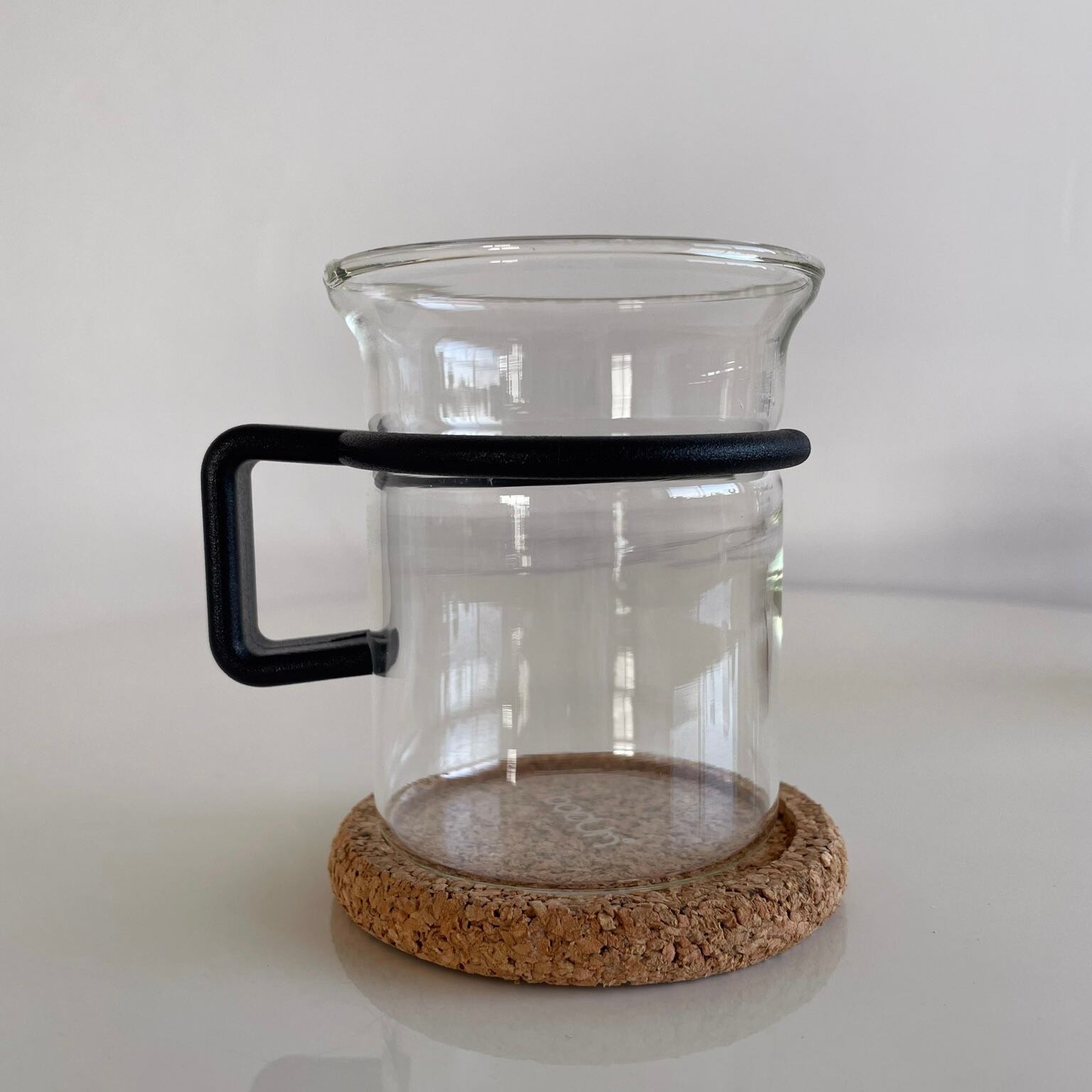耐熱ガラスで持ち手はブラックカラーがしまるプラスチック。