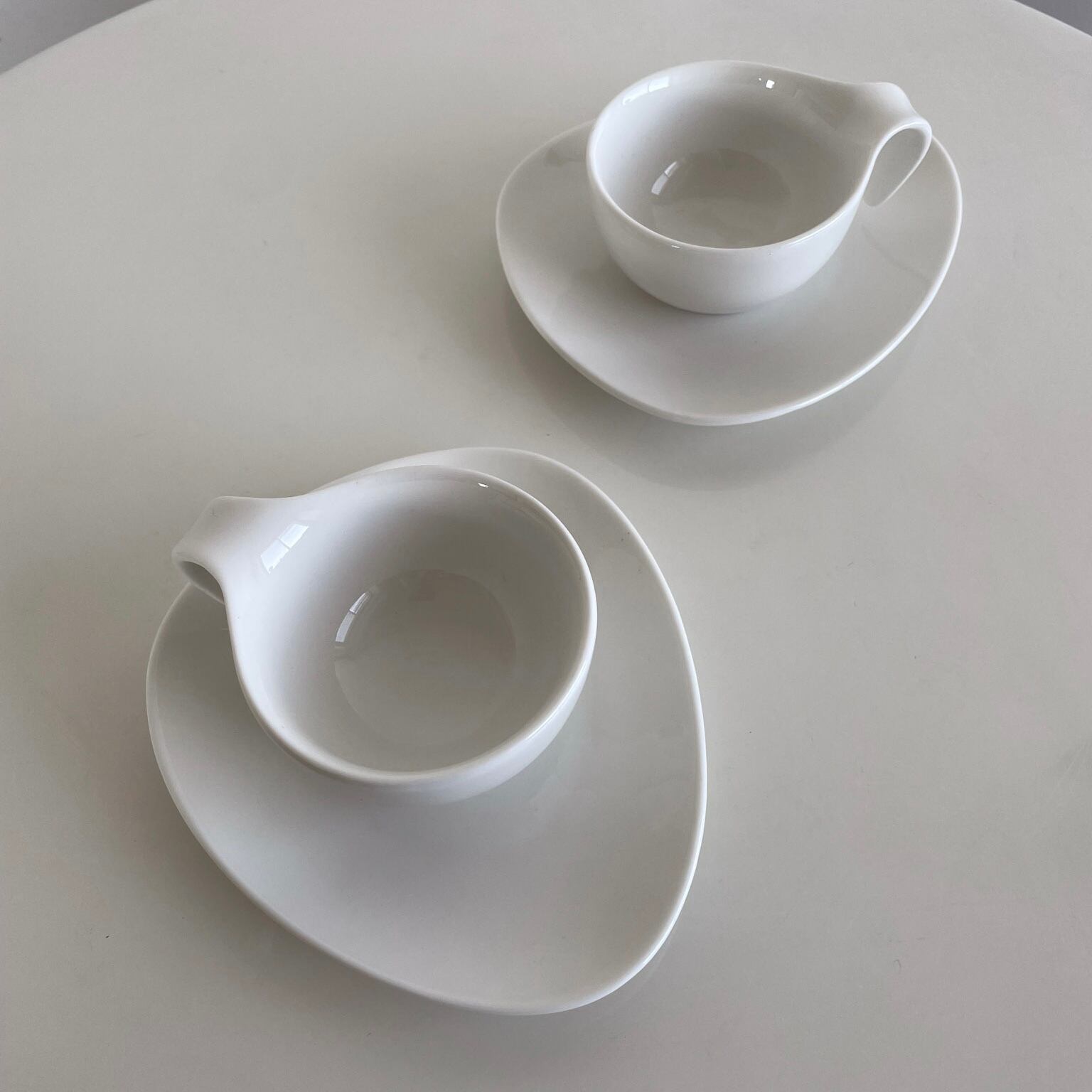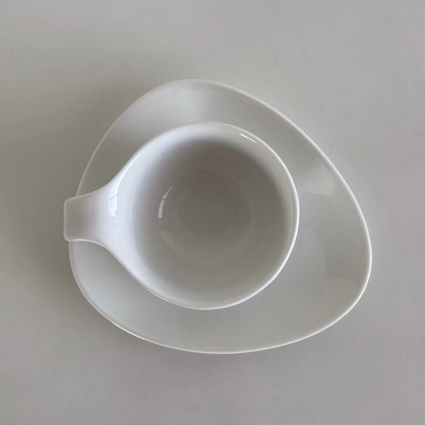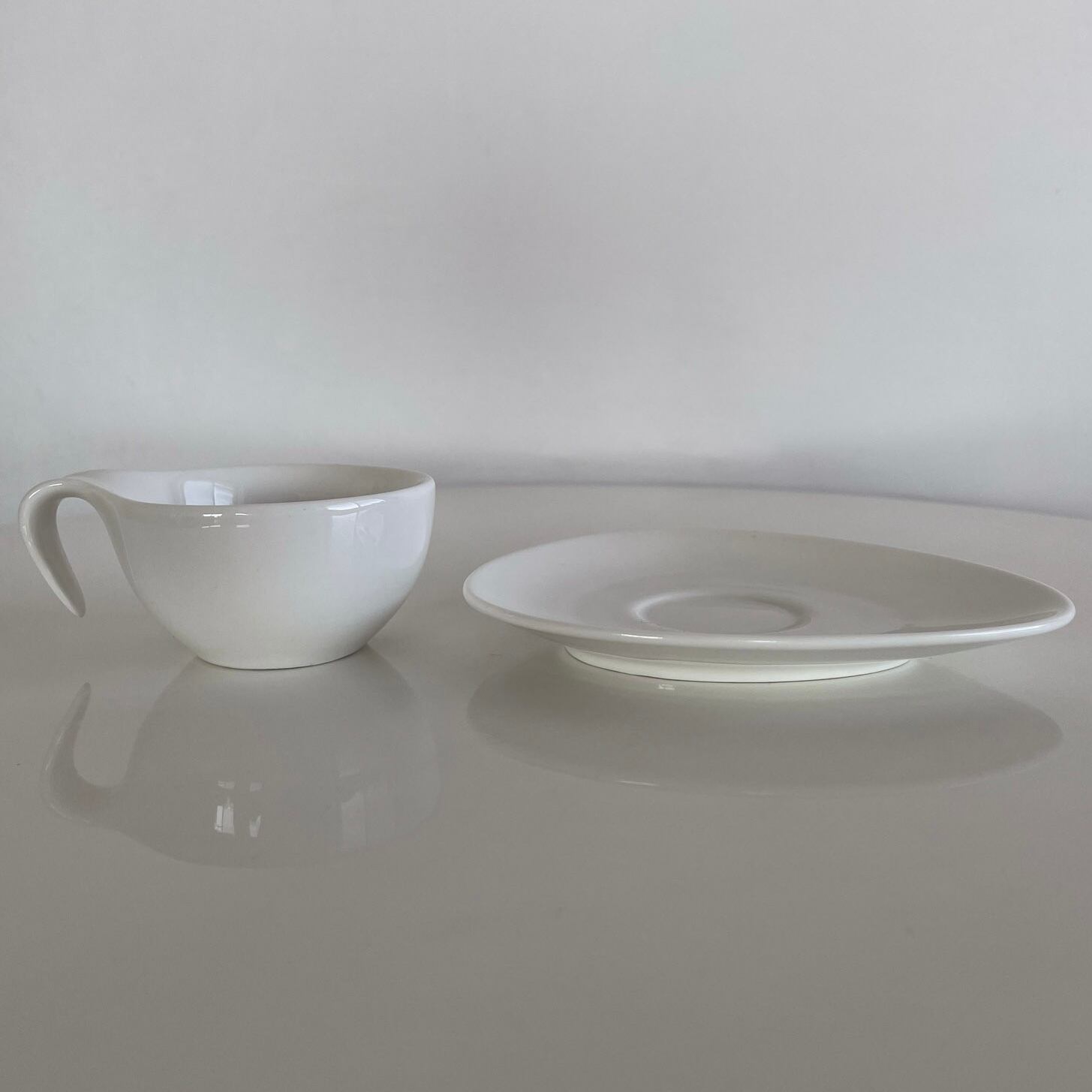 アトミック型のソーサーに、カップの持ち手が下にのびたミッドセンチュリーデザインを落とし込んだようなフォルムです。