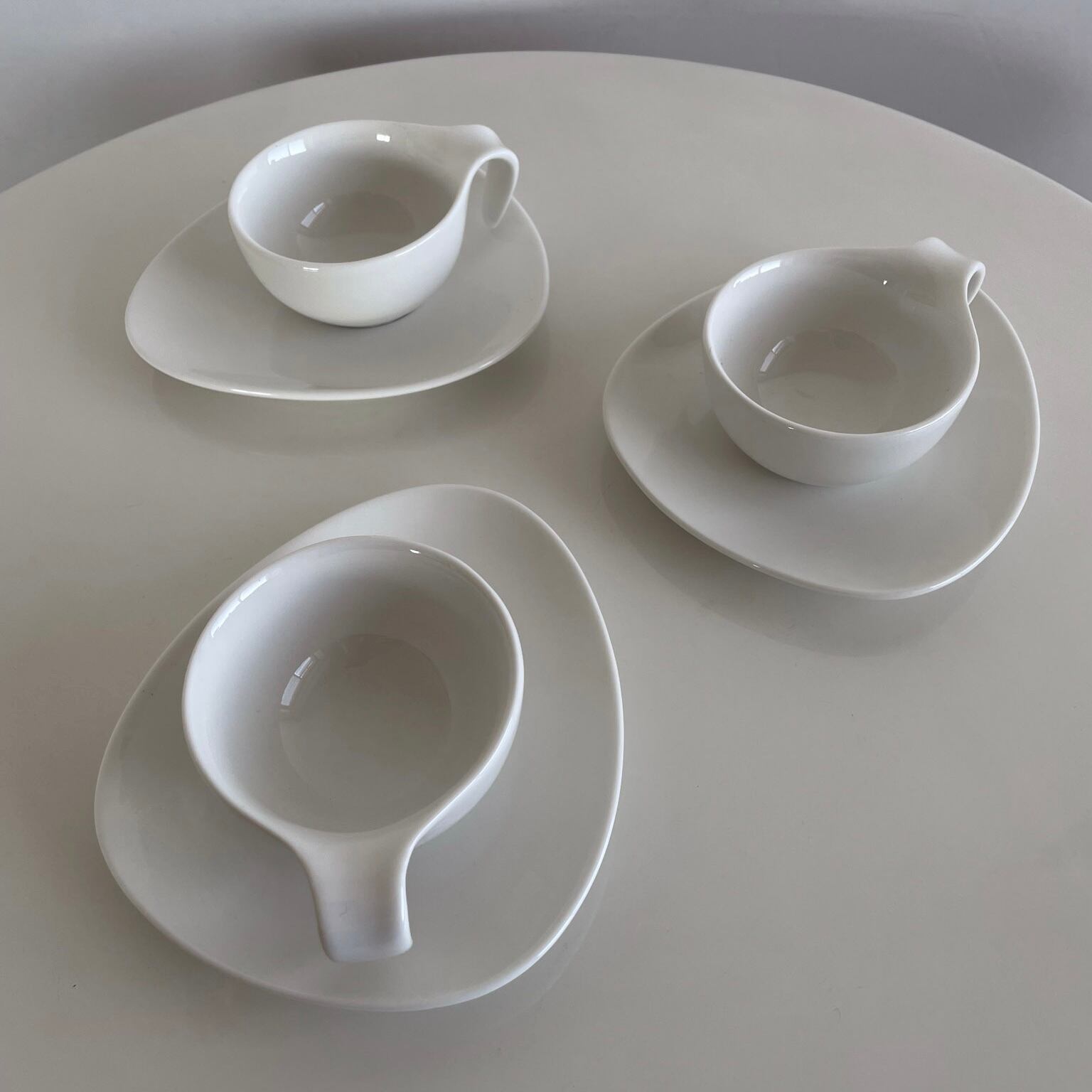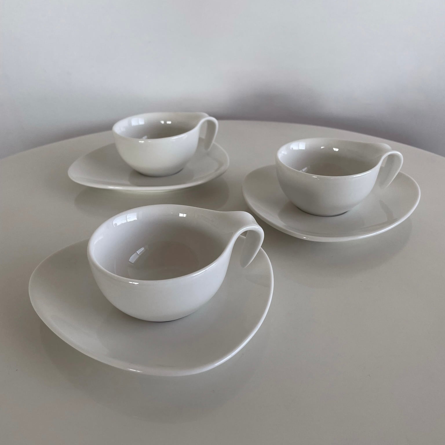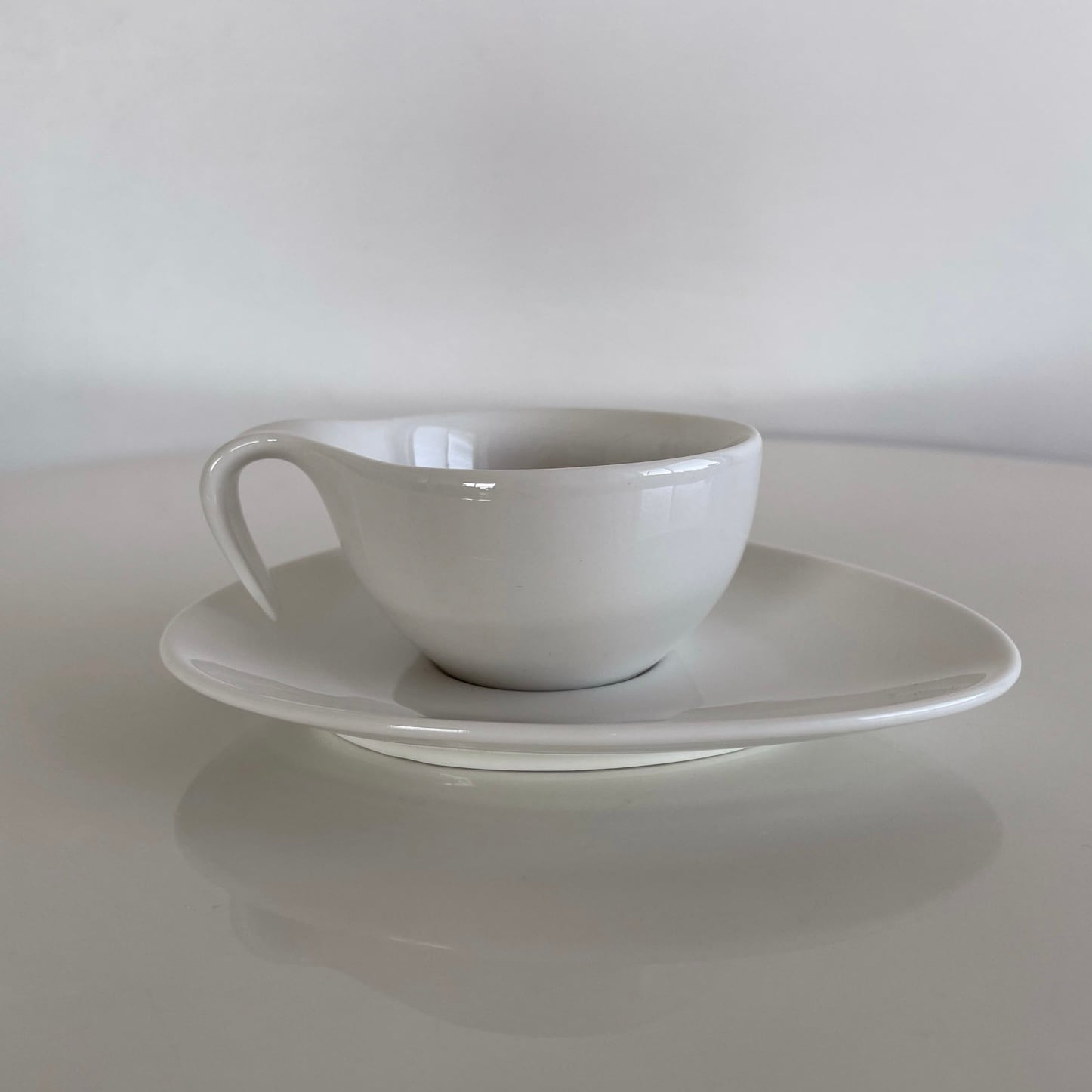 アトミック型のソーサーに、カップの持ち手が下にのびたミッドセンチュリーデザインを落とし込んだようなフォルムです。