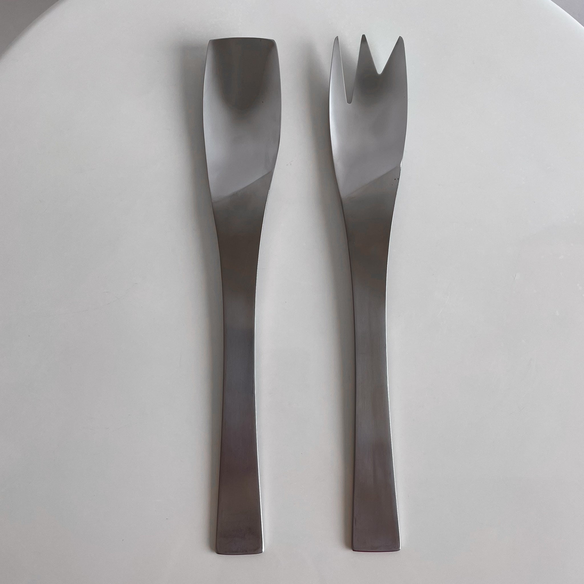 程よいツヤ感と持ち手部分のマットさ、シンプルながらスプーンとフォークにエッジが効いたデザインとなっています。